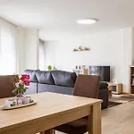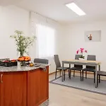 Lägenheten erbjuder gästerna möjligheter för självhushållning, som ett utrustat kök, samt matplats.